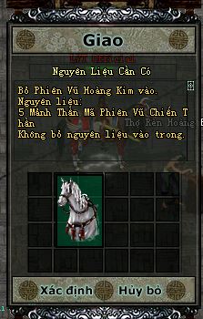 Lưu ý: Chỉ cần bỏ ngựa phiên vũ hoàng kim vào ô để nâng cấp (không bỏ mảnh thần mã phiên vũ chiến thần vào ô nâng cấp)